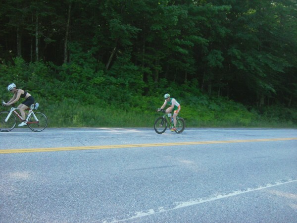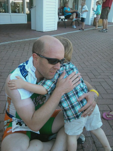 The rest of the swim was uneventful. Coming out of the water there were wetsuit strippers (hehehe…strippers) to help facilitate a quick transition time. Onto the bike and time to hammer. I passed some where around 100-150 people in the 20.5 mile jaunt (suffer fest) down and back up Rte 49. I was hoping to be under an hour and must say I accomplished that feat by averaging 20.9mph (so close to 21mph). I saw Shannon and the kids before they saw me, but she was able to get a few shots and lots of cheers in for me. It is always nice to have family supporting you at the races.