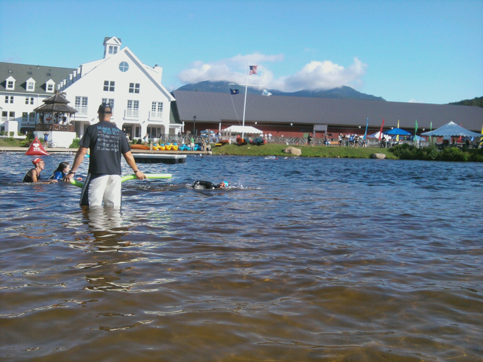 After a few trips back to the car, forgot timing chip, did not have a swim cap in race packet so I had to go back to registration, and forgot a water bottle I was all set. That is until I pulled my goggles out and the seal on the left eye was half way torn off. Luckily there was a shop set up in the Village Square selling goggles, for cheap to boot, and in orange. I was now ready to go. I hit the water for a quick warm up and then came out to await my start time. The swim is a time trial start with one person starting every 5 seconds, and with my number being 411 it was almost 40 minutes until I actually hit the water. It gave me time to talk with Miiko Bradley, the Robichaud’s, and a few other people I know. That helped me not think about my nerves too.