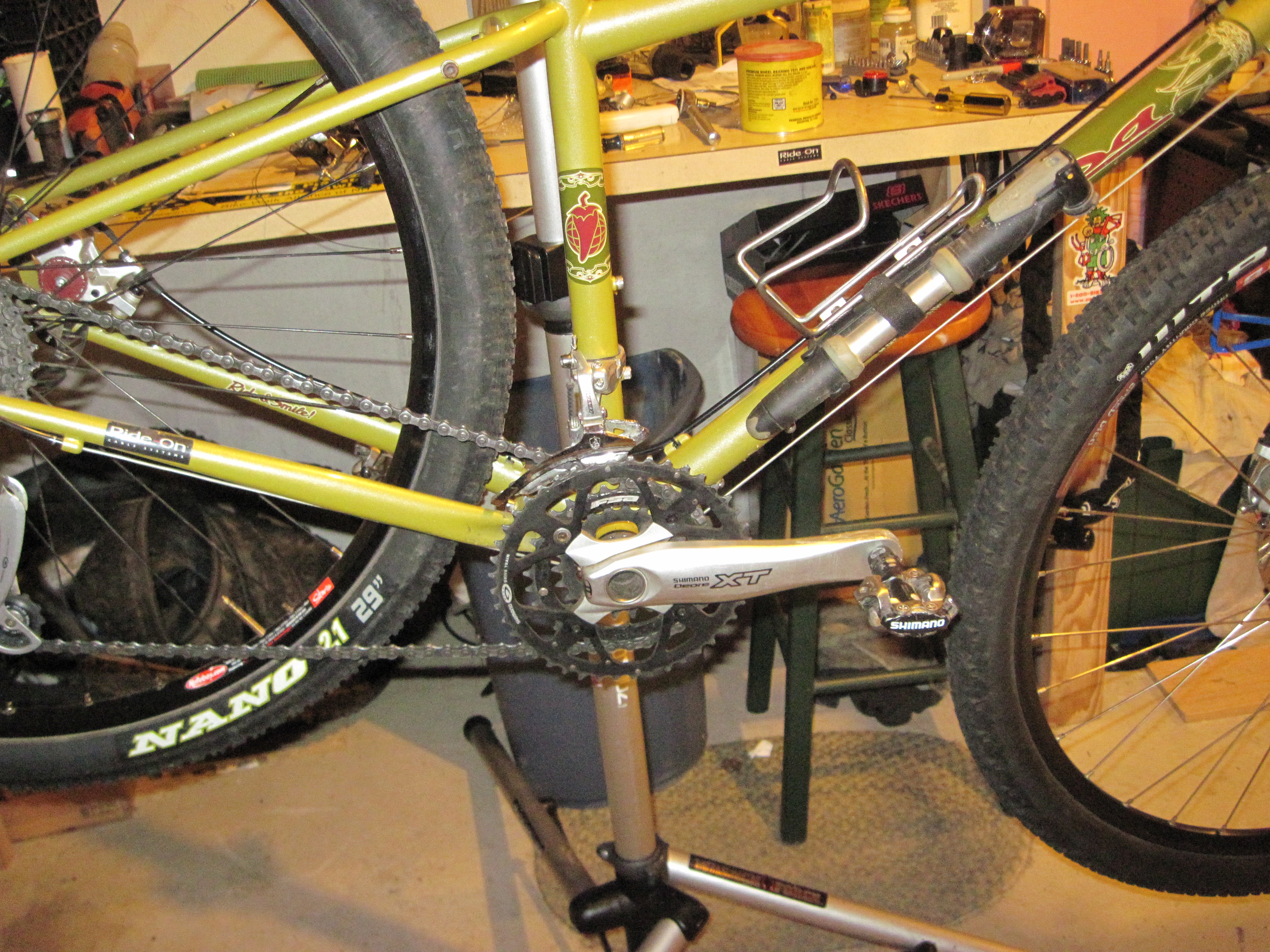 I don’t really know why it took me so long to figure this one out, but it came to me early last week…..I have a 2 x10 crankset on the Fargo. Why not just steal the crank off that bike and put the XT triple on the Fargo and call it good…So last Thursday during a rainy evening, that is exactly what I did.